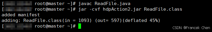 使用javac编译刚刚编写的代码,并使用jar命令打包为hdpAction2.jar。