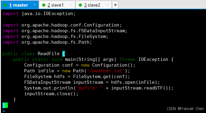 在master服务器上执行命令vim ReadFile.java,编写HDFS读文件程序: