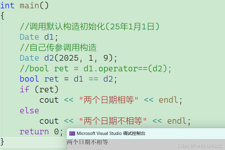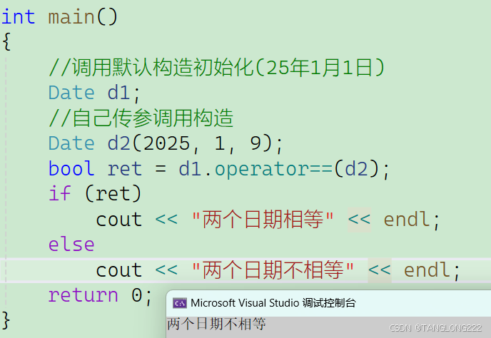 };上面就是我们日期类的相等运算符的重载函数,是不是一点都不难呢?只需要按照逻辑上的需求写对应的代码即可,接下来又有一个难点,就是我们写好了对应的运算符重载函数,该怎么使用呢?首先是第一个方法,这运算符重载不是个成员函数吗?我们就按照成员函数的调用方法对它进行调用即可,如下: