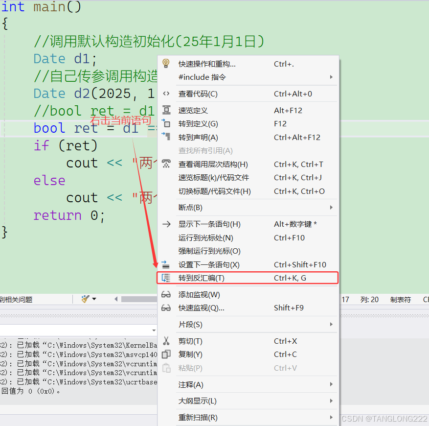 首先按f10进入调试模式,然后对着d1 == d2这条语句右击,在快捷菜单中选择转到反汇编,我们就可以看到这条语句其实被转化成了成员函数的调用,如下: