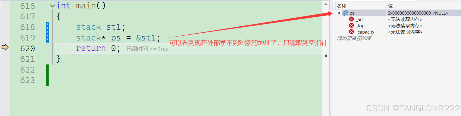 }接下来我们来测试一下这段代码是否会按照我们预期进行,也就是取不到当前对象的地址,只能取到空指针,如下: