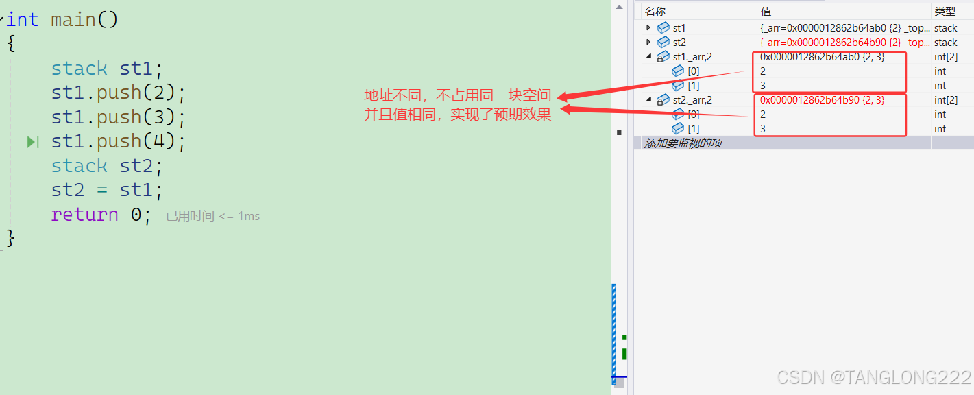 }在上面我们就自己写了一个赋值重载,内部的逻辑和拷贝构造差不多,外部的语法结构和运算符重载那里讲的一样,所以总体而言难的应该是上面列出的3点赋值重载的特点,那么我们接下来调试一下这段代码,看看我们写的赋值重载是否能解决深拷贝的问题,如下: