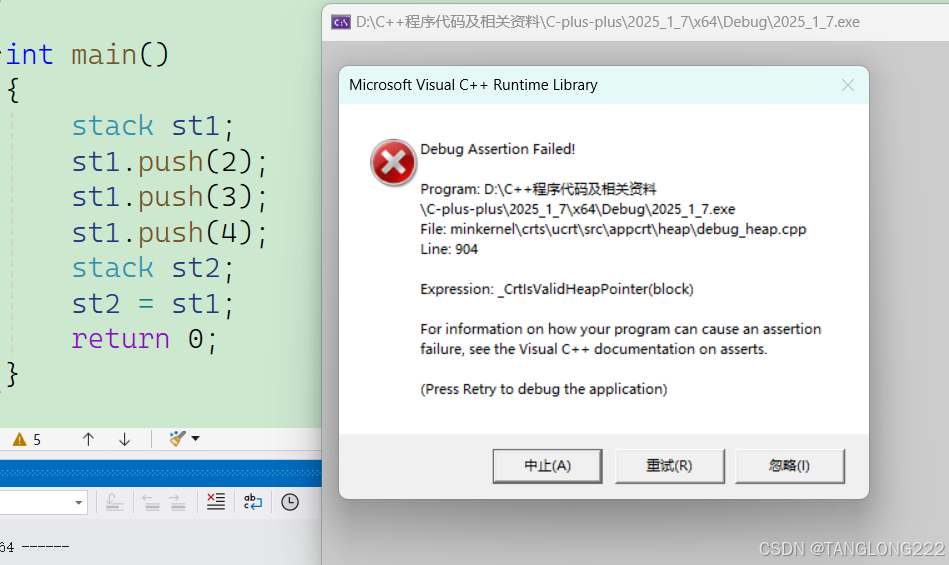 }按照我们的分析,上面的Stack类的赋值重载需要深拷贝,而编译器默认生成的赋值重载是浅拷贝,会导致同一空间被析构两次,最终导致程序运行出错,那么我们就来运行这段代码试试,看看跟我们的预期是否一样,如下: