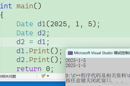 }上面我们就使用了默认的赋值重载将d1赋值给了d2,应该默认会实现浅拷贝,应该没有问题,我们来看看代码运行结果: