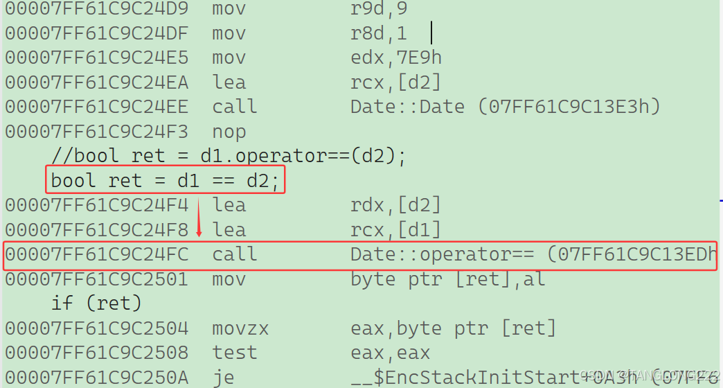 可以看到d1 == d2这条语句在汇编层变成了对应运算符重载函数的调用,我们方便了,是因为编译器悄悄帮我们做了很多事