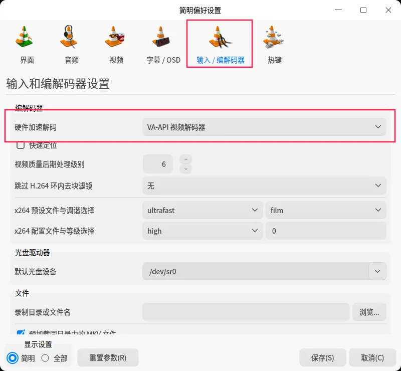 VLC 中的硬件加速在界面中通过“工具 → 偏好设置 → 输入/编解码器 → 硬件加速解码”进行控制。
