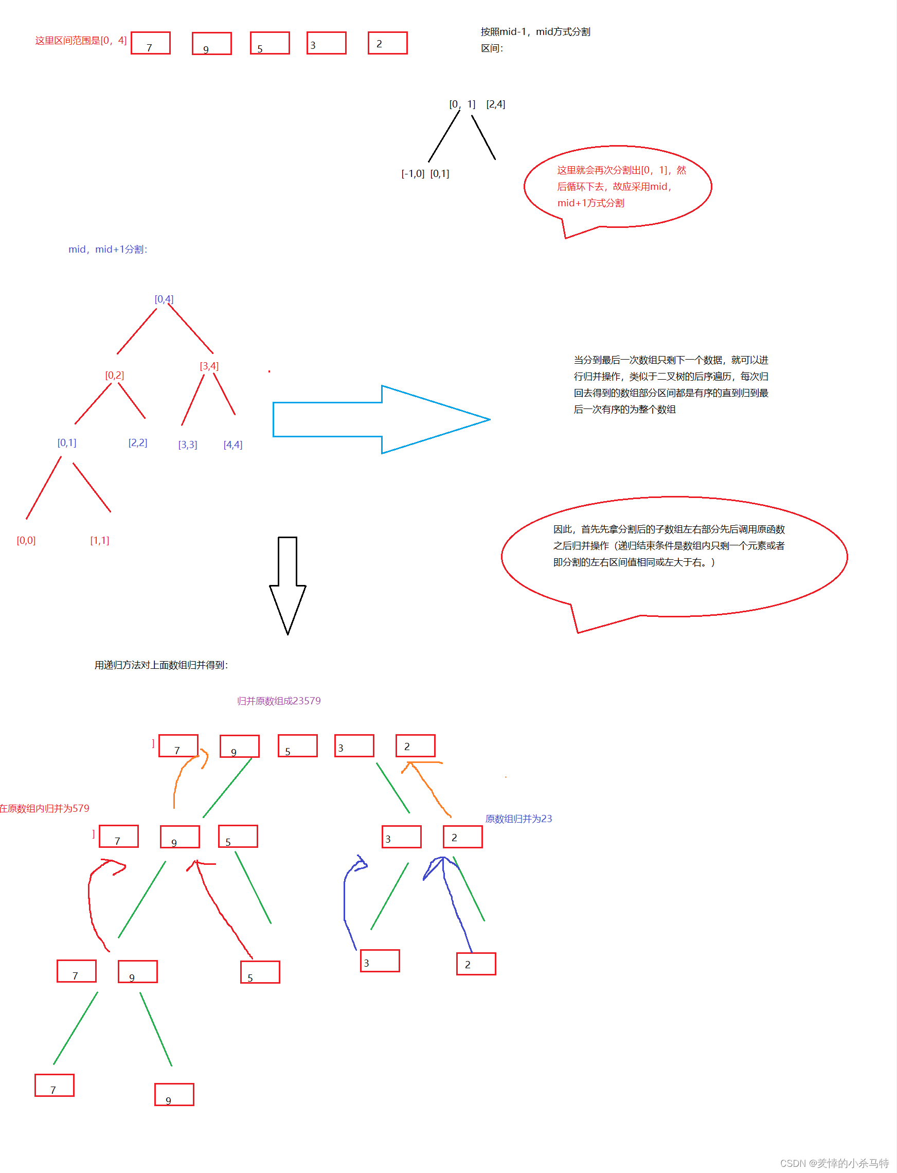 实现代码的同时,首先要先分割原数组为两个子数组,这里就用到了分割方法,分割的区间为[left,mid][mid+1,right]这样分割,可以避免出现区间循环的问题([偶数,偶数+1])。