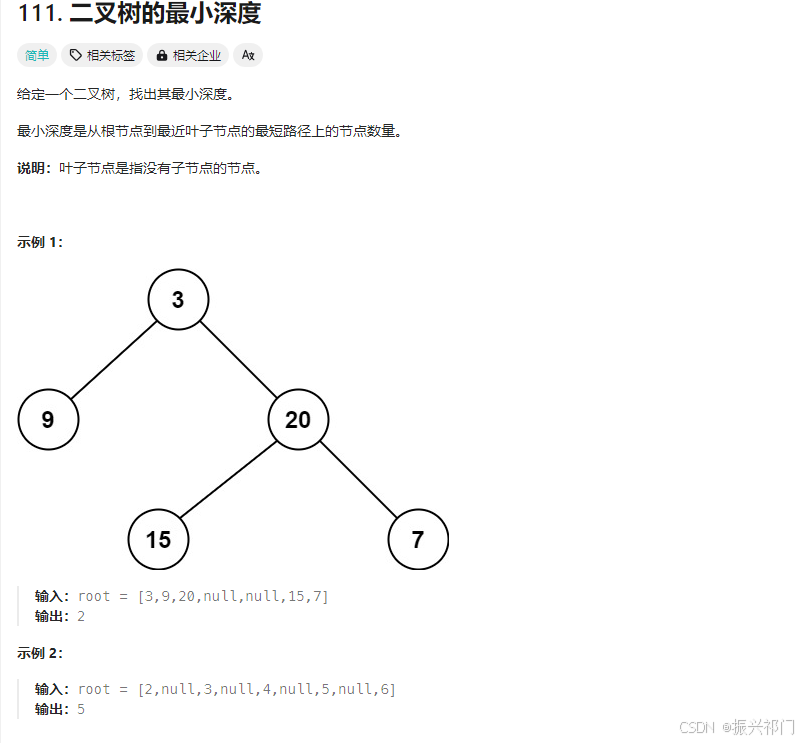 首先可以想到使用深度优先搜索的方法,遍历整棵树,记录最小深度。 对于每一个非叶子节点,我们只需要分别计算其左右子树的最小叶子节点深度。这样就将一个大问题转化为了小问题,可以递归地解决该问题。
