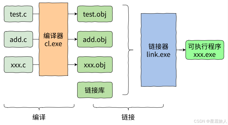 ⼀个C语言的项目中可能有多个.c文件⼀起构建。 多个.c文件单独经过编译器,编译处理生成对应的目标文件。(在Windows环境下的目标文件的后缀是.obj,Linux环境下目标文件的后缀是.o) 多个目标文件和链接库⼀起经过链接器处理生成最终的可执行程序。