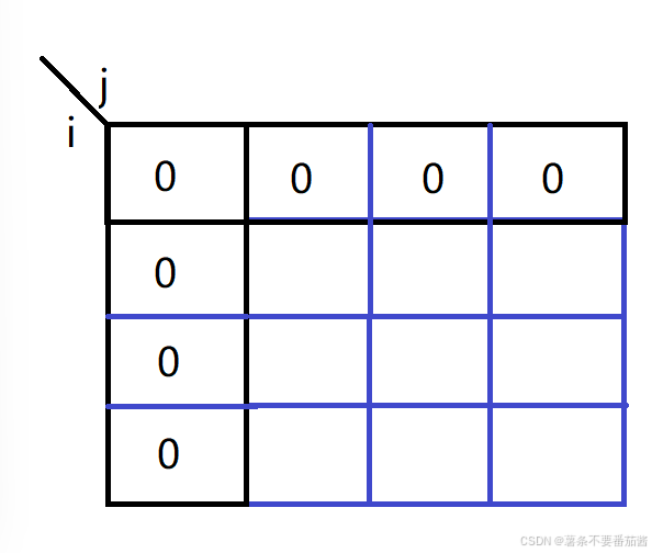 3. 初始化 选择物品是从下标1 开始的, 到n结束, 那么dp表就需要多创建一行一列,处理两个细节问题: ①下标之间的对应关系: i -> i j -> j ②初始化虚拟节点: 第一行表示的是 物品可选,总体积不超过 j 的最大价值. 既然没有物品,那就不选,全都为0. 第一列表示的是 所选物品总体积不超过0的最大价值. 此时最大价值就是0,不选即可,全都为0.