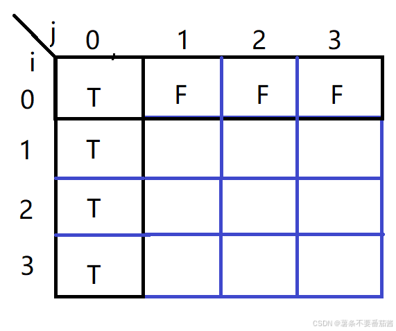 第一行 i=0意味着没有元素可选,怎么选最大值都只能是0,所以dp[0][0] = true,其余全部初始化为false. 第一列 j=0意味着需要凑成和为0, 直接不选即可. 故从i=1开始全部初始化为true.