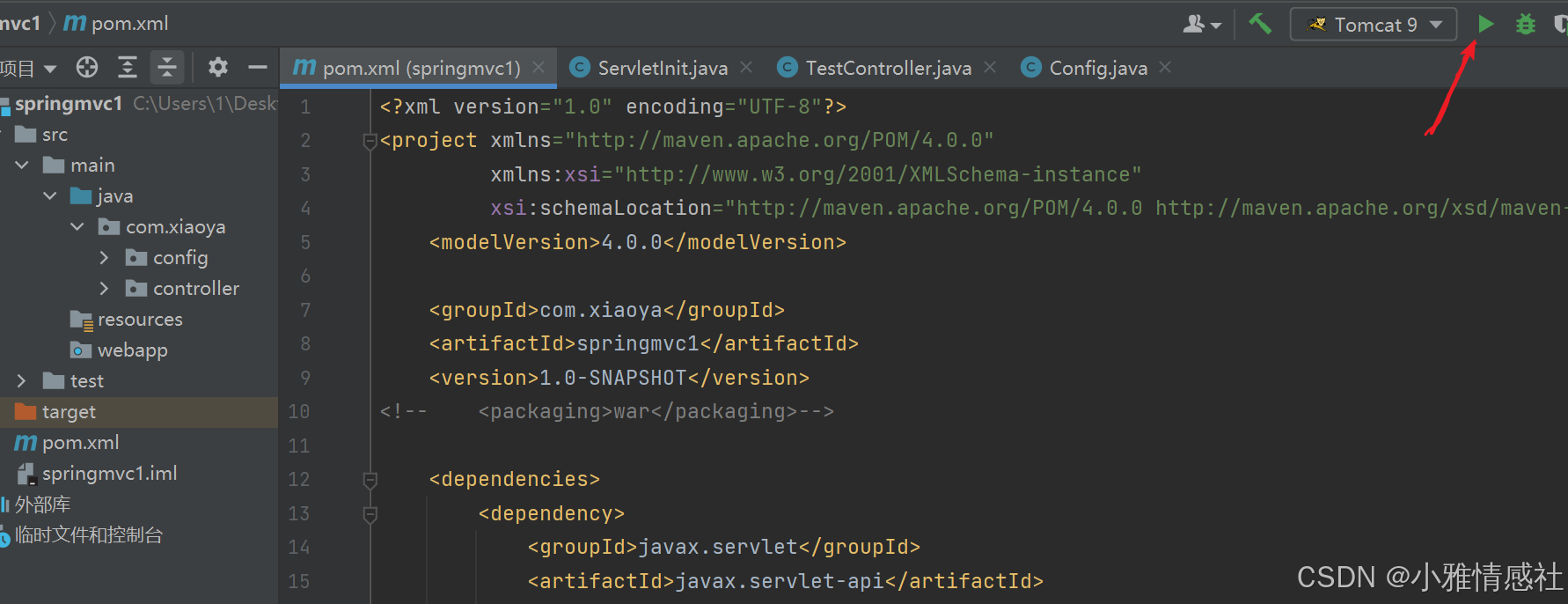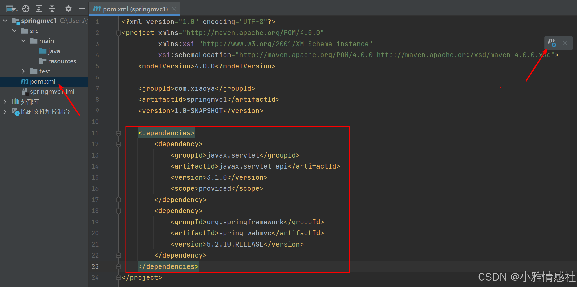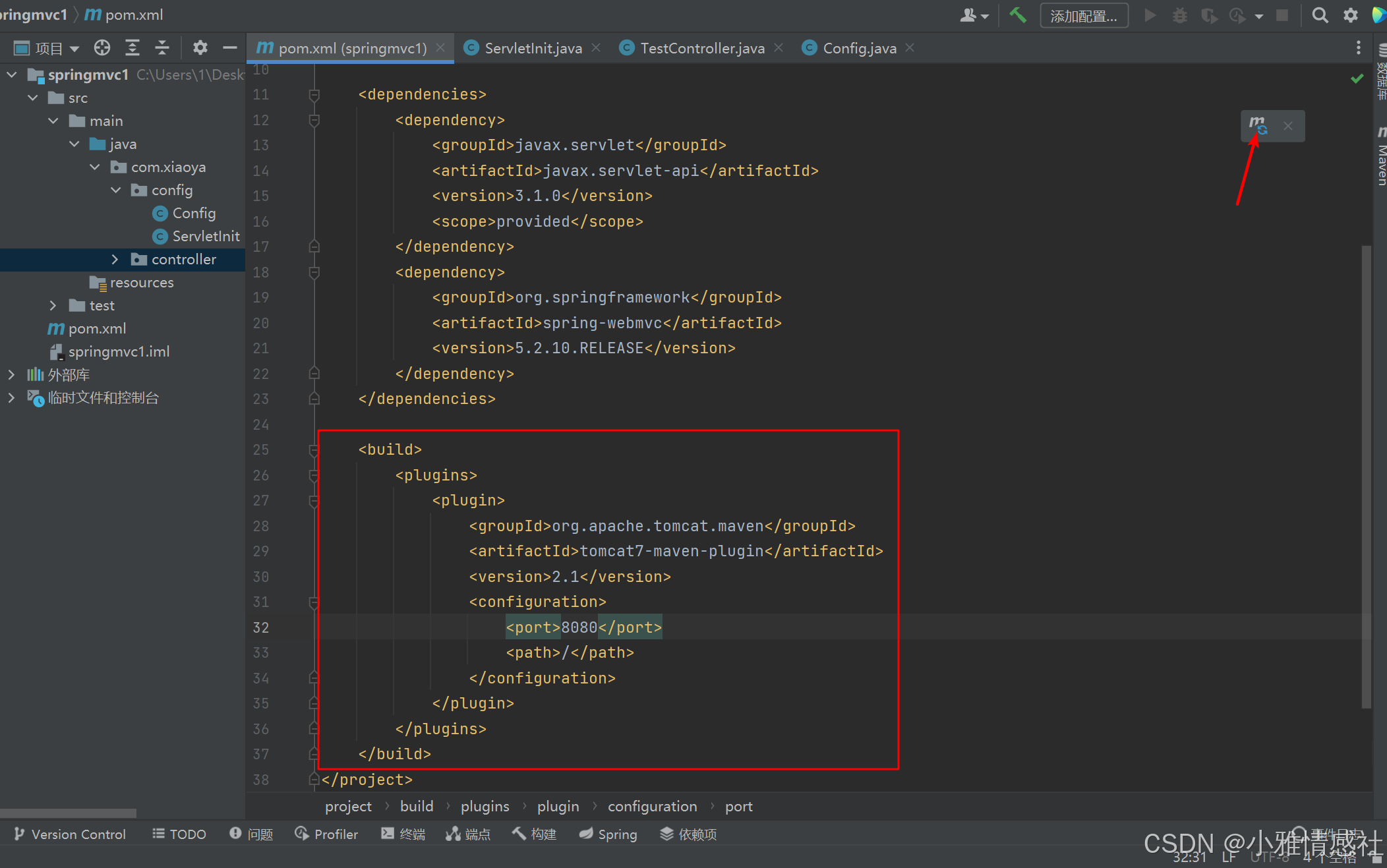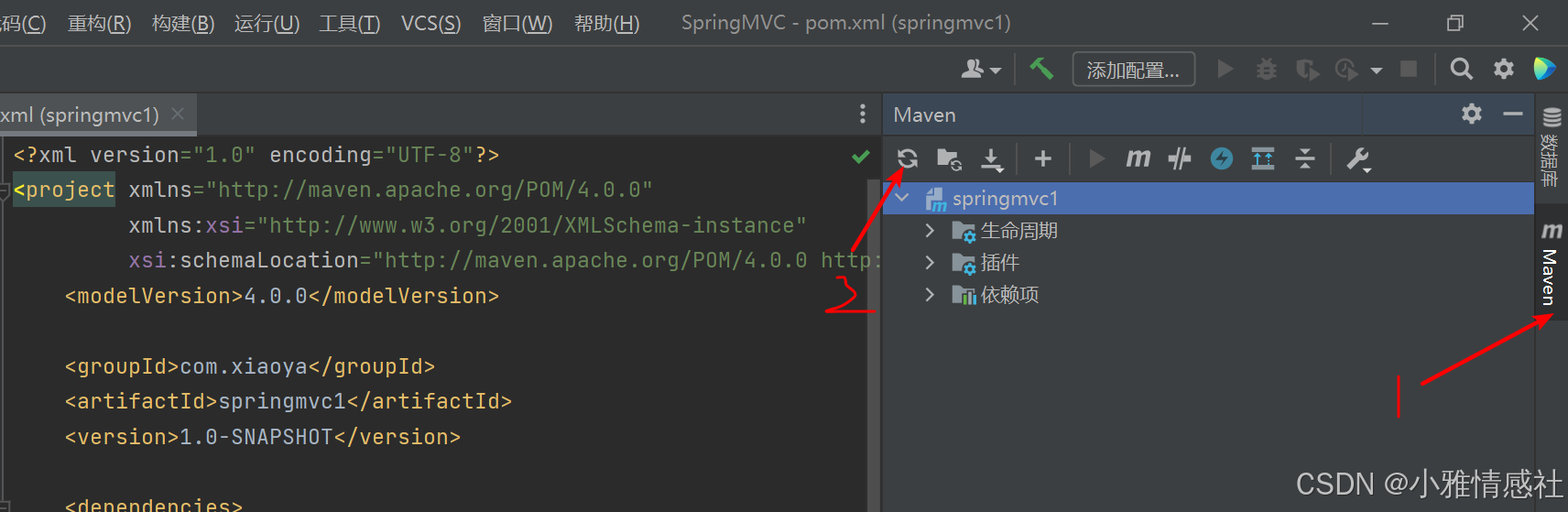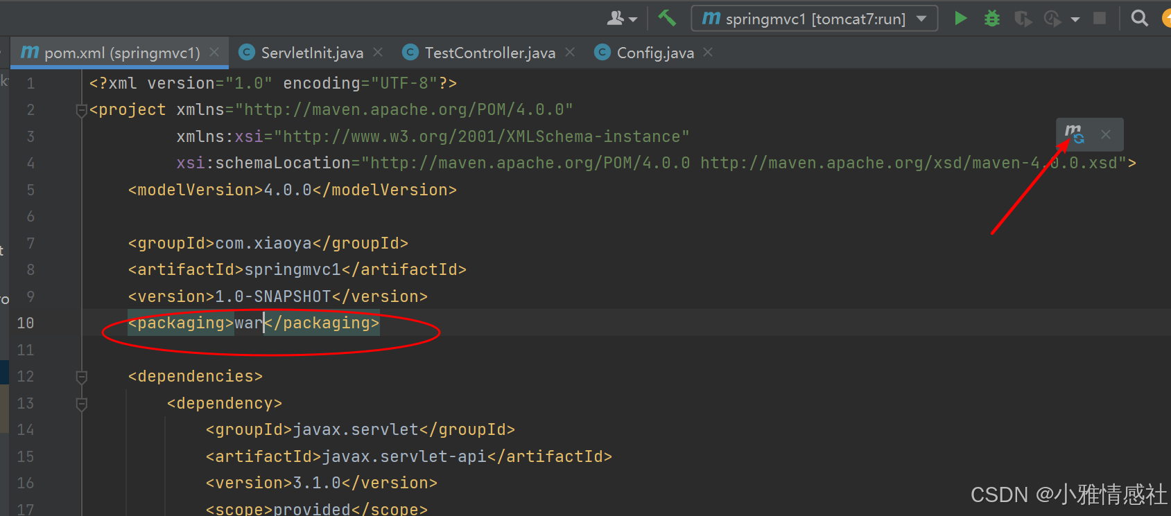<packaging>war</packaging>即打为war包的形式运行,点击一下maven按钮,只要pom.xml内容有变更就点一下maven按钮就对了。