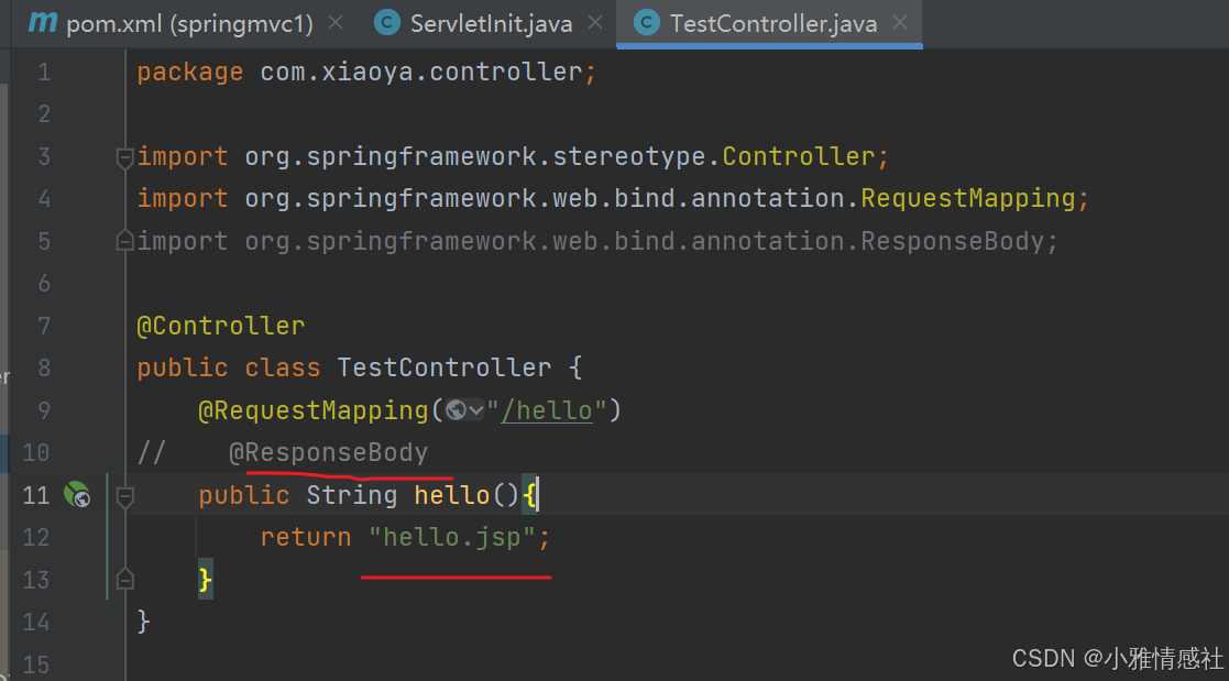 看到这已经差不多了,但是我们得把坑补完,前面说过不加@ResponseBody的话返回的就是静态资源名,如图,我们将@ResponseBody注解去掉,返回的内容改为hello.jsp
