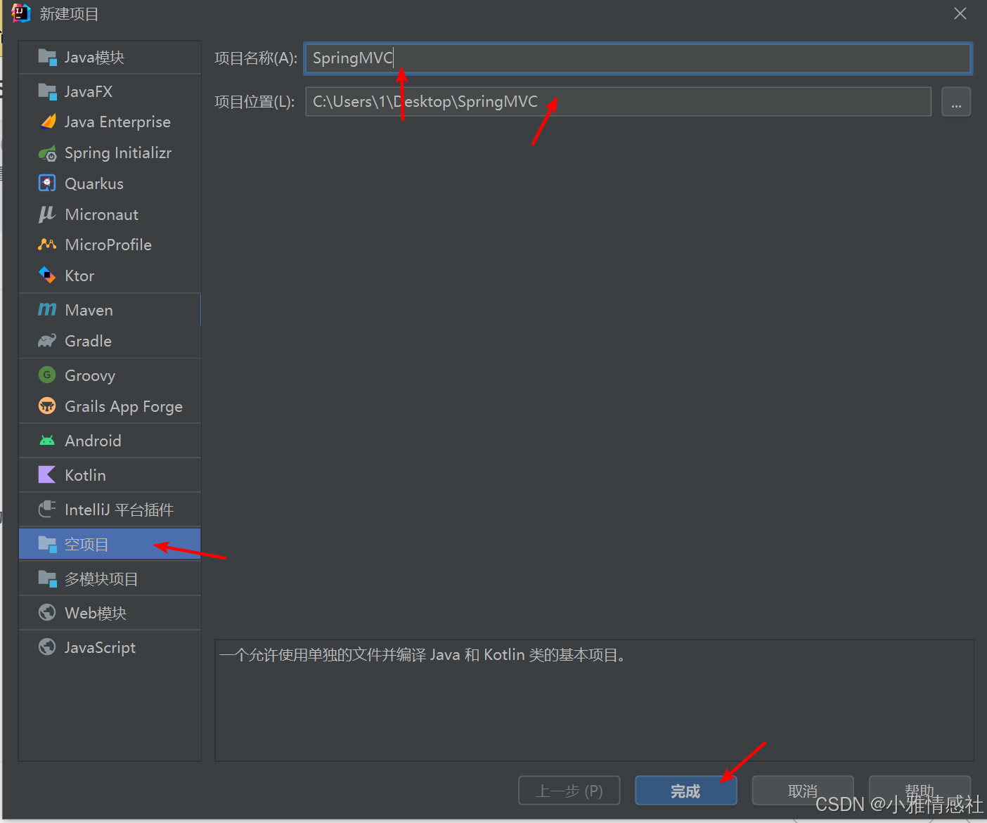先建个空项目,自定义名字、项目位置等,这些都可以随便,然后完成。