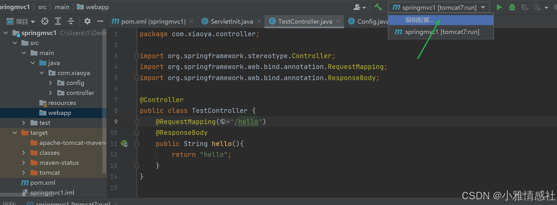 然后点击运行按钮即可,会自动跳转到浏览器,访问/hello路径就行了。注意上下文的路径,如果上下文的路径默认没更改的话根路径就不是/,如图应该是/springmvc1_war_exploded,所以没更改的话应该访问/springmvc1_war_exploded/hello。自动跳转到浏览器的时候也是跳到/springmvc1_war_exploded