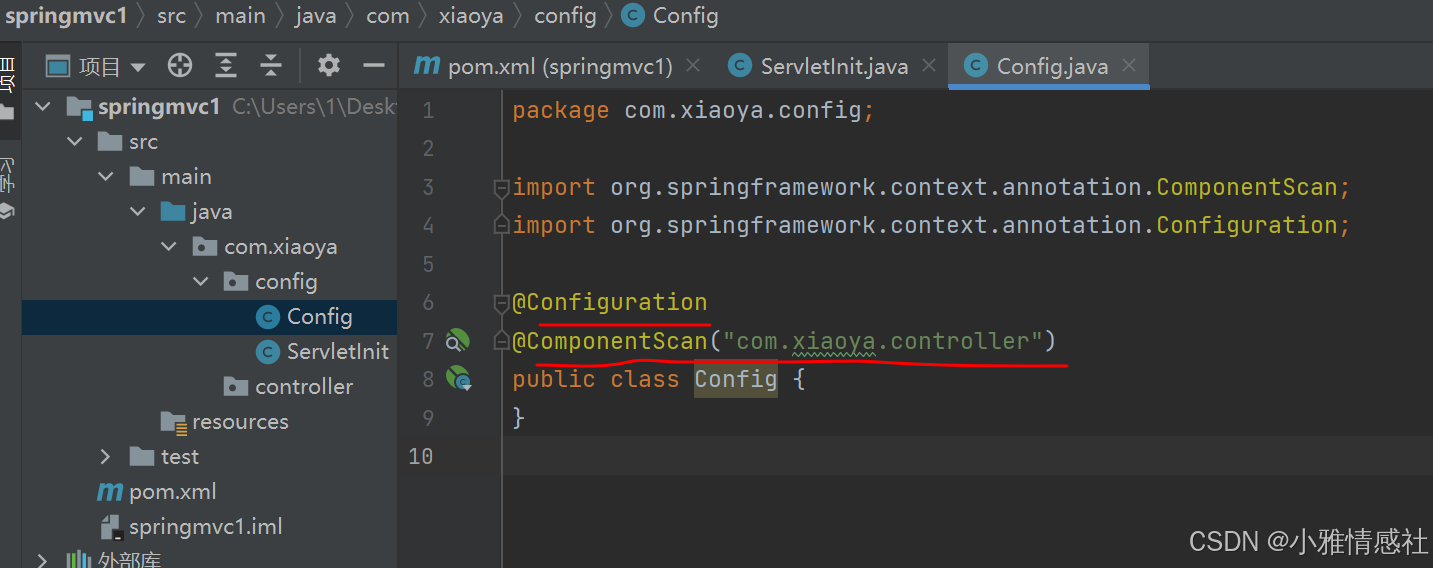 第一个注解即标记为配置类,第二个注解就是扫描com.xiaoya.controller包里面的类