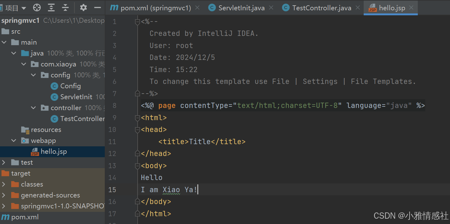 启动tomcat,访问 http://localhost:8080/springmvc1_war_exploded/hello就是访问hello.jsp
