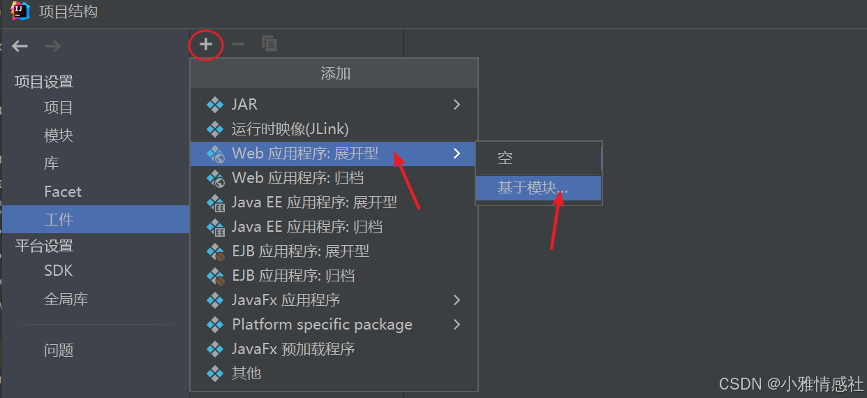 点击+按钮,选择Web应用程序:展开型,点击基于模块,选择我们这个项目的模块,我们这本来就只有一个模块,所以直接确定就行了。