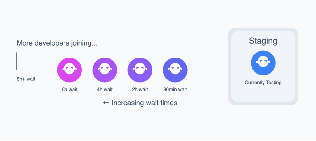 就在上周,我与一家快速发展的安全公司的一位工程总监交谈。其由50名工程师组成的团队实施了一些让我停顿的东西:一个供开发人员在预发布环境中进行测试的注册系统。是的,你没看错:工程师们不得不排队轮流部署和测试他们的代码更改。到周五下午,积压工作会变得令人沮丧地漫长,开发人员不得不等待数小时才能有机会验证他们的工作。虽然有创意,但这清楚地表明了一个更深层次的问题,我在不断发展的工程组织中反复看到过这个问题。