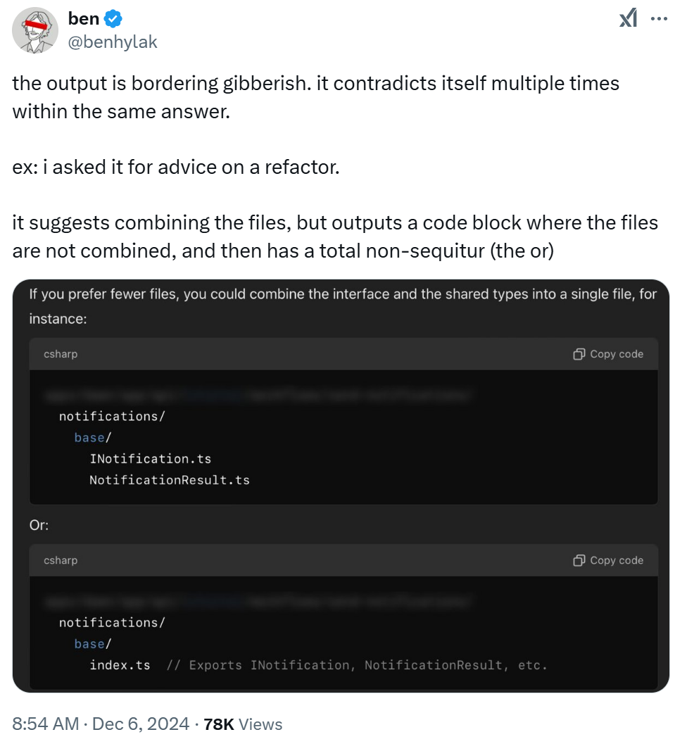 「输出内容几乎接近胡言乱语,在同一个答案中多次自相矛盾。例如:我向它征求关于重构的建议。它建议合并文件,但输出的代码块中文件并未合并,然后又出现了完全不相关的结论。」