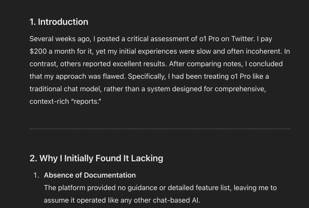这与使用 o1 取得成功的方法完全相反。不要告诉它如何做 —— 只告诉它做什么。然后让 o1 接管,自行规划和解决问题的步骤。这就是自主推理的作用所在,实际上这比你作为人工环节手动审查和聊天要快得多。