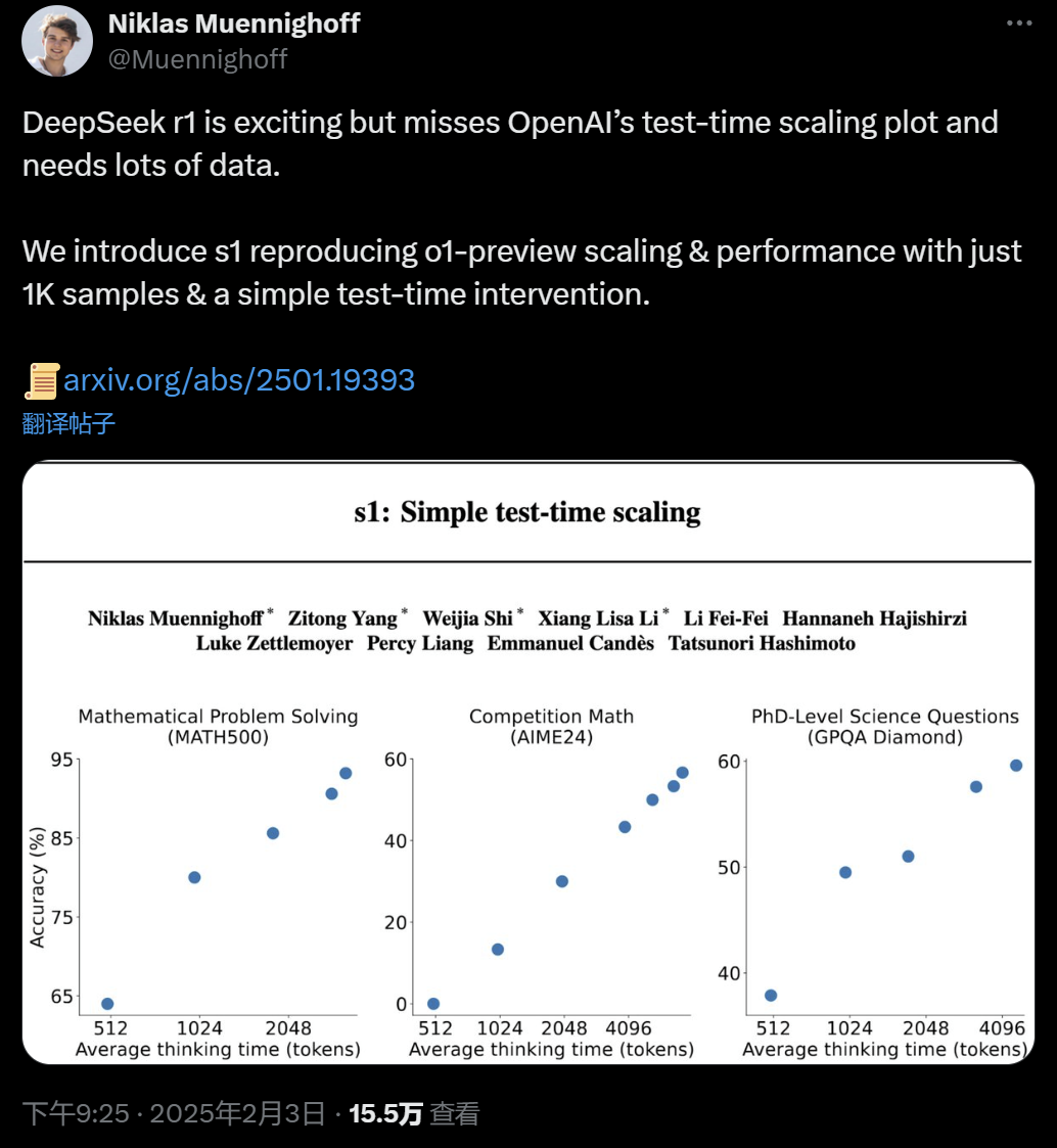s1 论文作者,斯坦福大学在读博士 Niklas Muennighoff 表示,DeepSeek r1 令人兴奋,但其缺少 OpenAI 的测试时间扩展图并且需要大量数据。我们推出的 s1 仅使用 1K 样本和简单的测试时间干预即可重现 o1 的预览扩展和性能。