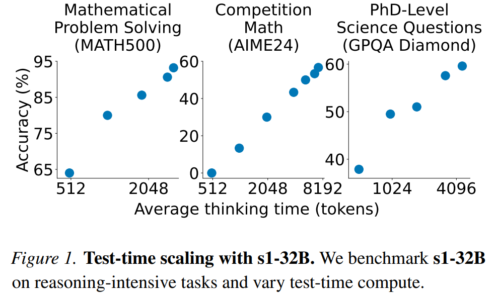 测试时间扩展。图 1 展示了 s1-32B 在使用预算强制技术后,随着测试时间计算资源的增加,性能的变化情况。