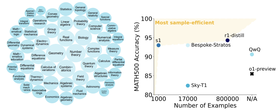 在 s1K 上对 Qwen2.5-32B-Instruct 语言模型进行监督微调(16 块 H100 GPU,26 分钟)并为其设定预算强制后,新模型 s1-32B 在竞赛数学问题上的表现比 o1-preview 高出 27%(MATH 和 AIME24)。