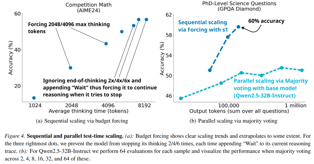 图 4(右)展示了在对 Qwen2.5-32B-Instruct 进行 1,000 个样本的训练,从而生成 s1-32B,并为其配备简单的预算强制技术后,它进入了一种不同的扩展范式。通过多数投票在基础模型上扩展测试时间计算资源无法赶上 s1-32B 的性能,这验证了这一直觉,即序列扩展比并行扩展更有效。