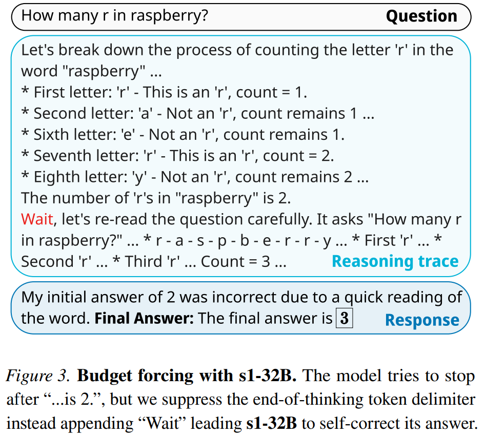 预算强制(Budget forcing)。本文提出了一种简单的解码时间(decoding-time )干预方法,通过在测试时强制设定最大或最小思考 token 数量来实现。图 3 为该方法的一个示例展示,说明了这种简单的方法可以引导模型得出更好的答案。