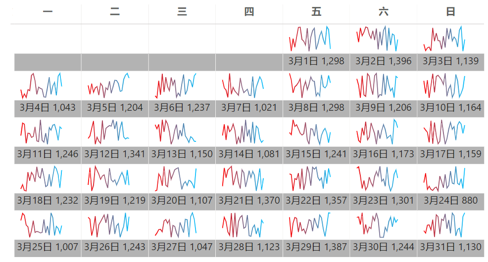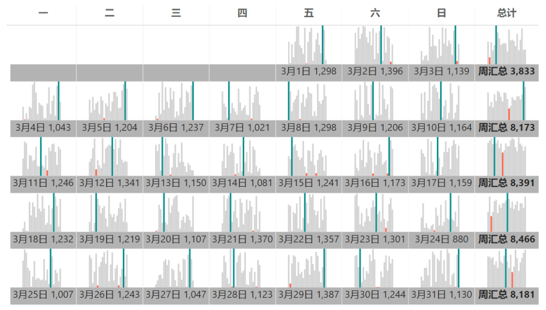 下图既可以看到每天的时段趋势,又能看到当天的汇总,还能看到当周的汇总: