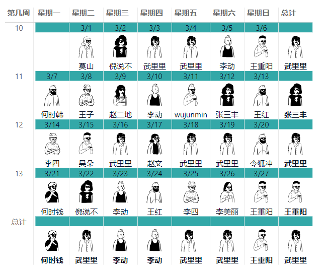 还是《Power BI 矩阵日历同时展示日周月销售冠军》这个例子,打开矩阵的总计,不仅能看到每天的销售冠军,还能看到周、月汇总冠军: