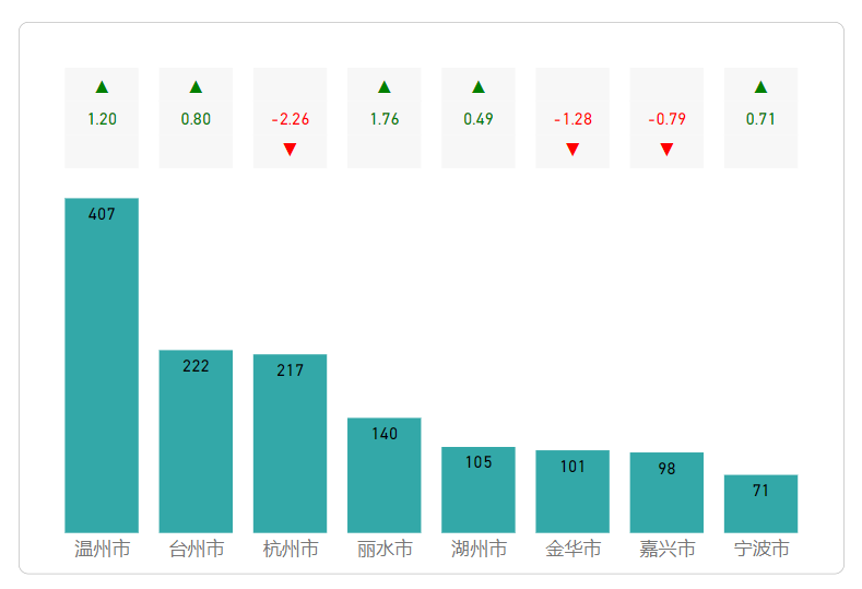 以上柱形图反映了当前值和同期对比的增长下降趋势。增长值的标签此处进行了优化,除了红绿颜色标识,箭头位置也对应做了区分,对比更鲜明。使用Power BI内置的堆积柱形图结合新数据标签,我们可以轻松实现以上效果。