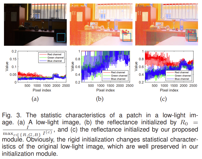 直观地,为了保留的整体结构,初始光照可以通过寻找三个颜色通道的最大值来初始化[7],初始反射层可以通过推导,其中表示逐元素除法。然而,这种刚性的初始化方式会导致色彩失真。如图3(b)所示,三个通道(例如,{R, G, B})的强度统计特性发生了变化。