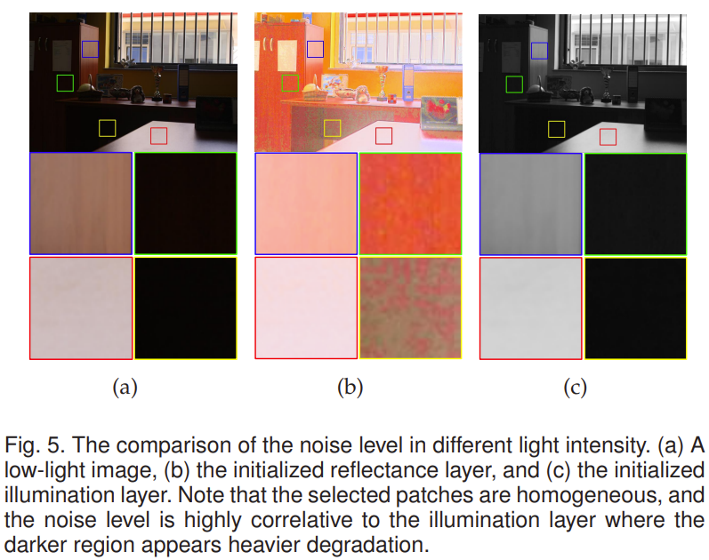 因此,通过将退化的输入到可学习的去噪网络中,可以获得更干净的反射层。特别是,如图5所示,反射层中出现的失真程度与光照层的亮度高度相关,较暗的区域伴随着更严重的退化。基于这一观察,可以设计一个涉及光照组件(即)的隐式先验,并将其代入,以便与聚合作为输入,用于指导反射层恢复。用于执行更新的网络可以表示为: