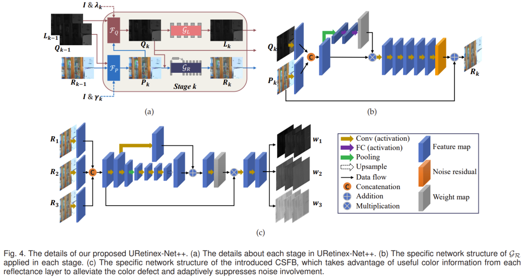 跨阶段融合块: 尽管先前版本(即URetinex-Net)在充分揭示低光图像方面表现出优越性,特别是在细节保留和噪声抑制方面,但URetinex-Net生成的结果往往饱和度较低。基于早期展开阶段的反射层具有更丰富的颜色信息的观察,我们提出利用这些信息来弥补色彩偏移问题。然而,早期展开阶段的反射层可能受到严重噪声的影响,因此直接使用这些反射层可能会给增强结果带来失真。为了充分利用反射层中的有用颜色信息并自适应地抑制噪声的参与,我们在URetinex-Net++中引入了一个跨阶段融合块,其结构如图4(c)所示。