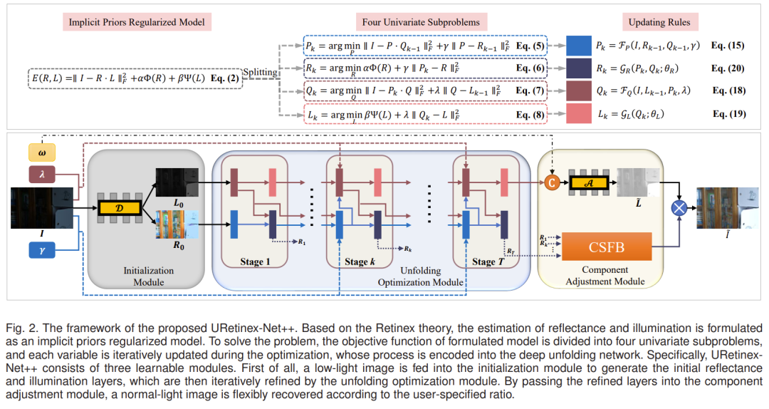由于设计特定的正则化项和具有挑战性,我们利用深度网络来自适应地拟合和的物理先验。因此,基于上述优化方案,我们将更新步骤映射到深度展开网络,并提出了一种新的LLIE框架。如图2所示,提出的URetinex-Net++由三个模块组成,即初始化模块(IM)、展开优化模块(UOM)和组件调整模块(CAM)。这三个模块的作用如下: