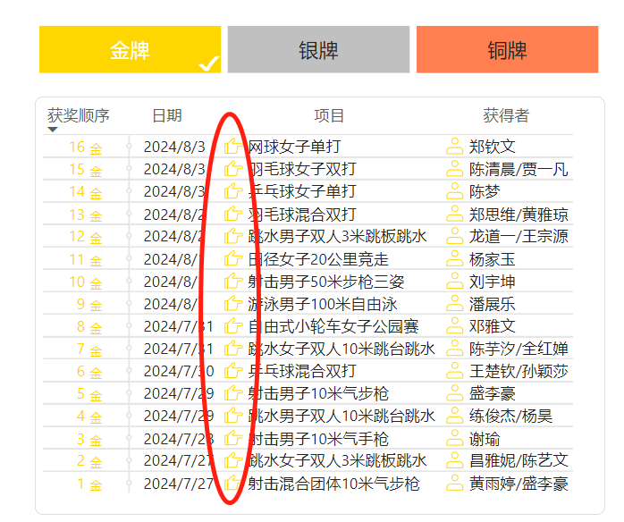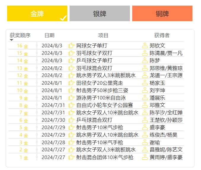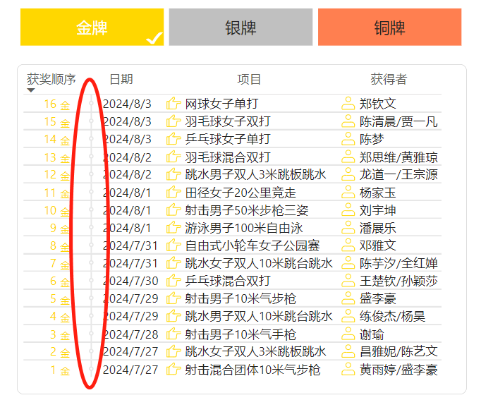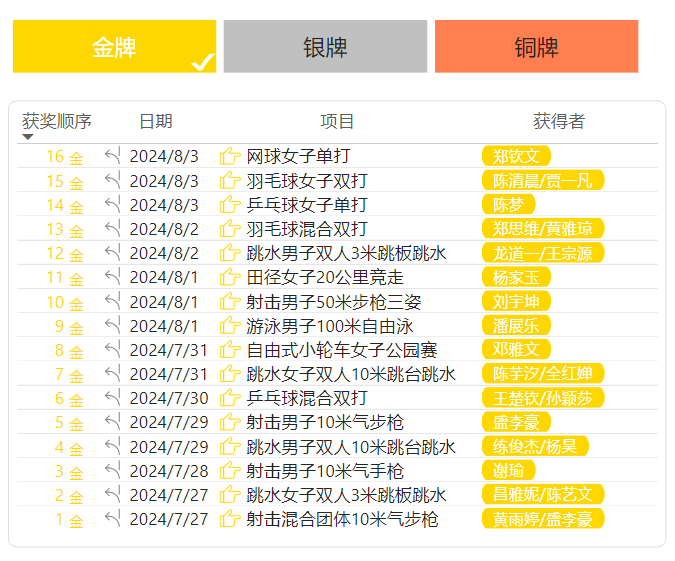 Power BI 使用表格也可以制作时间轴榜单,下表参考了腾讯的部分设计元素,但又有所不同,选择金牌时: