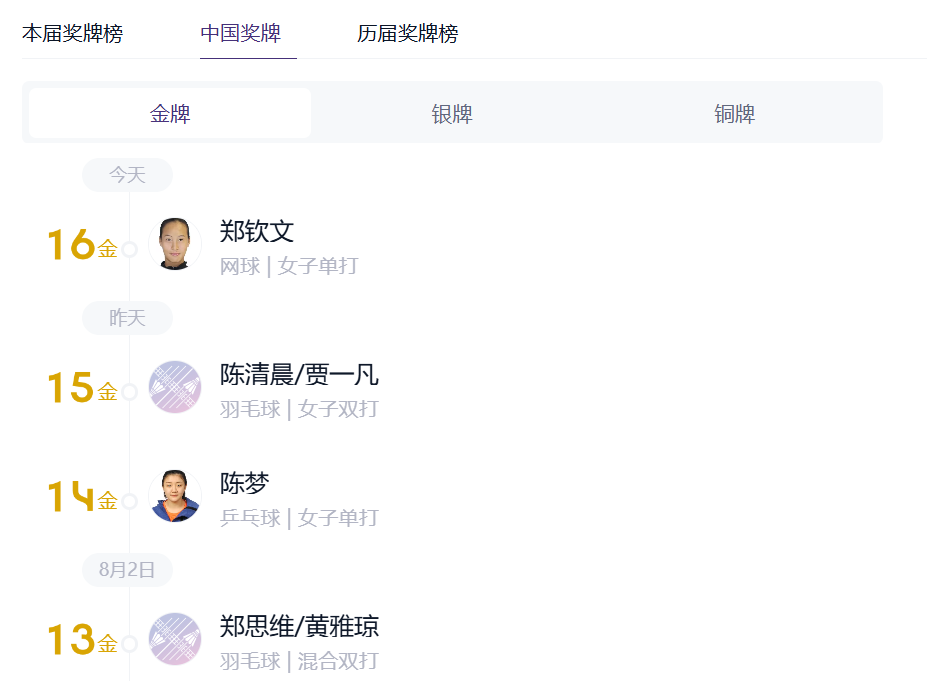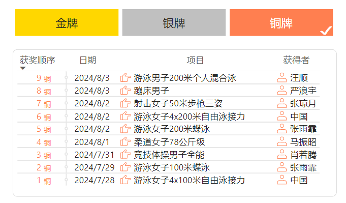 数据来源:https://sports.cctv.com/Paris2024/medal_list/index.shtml