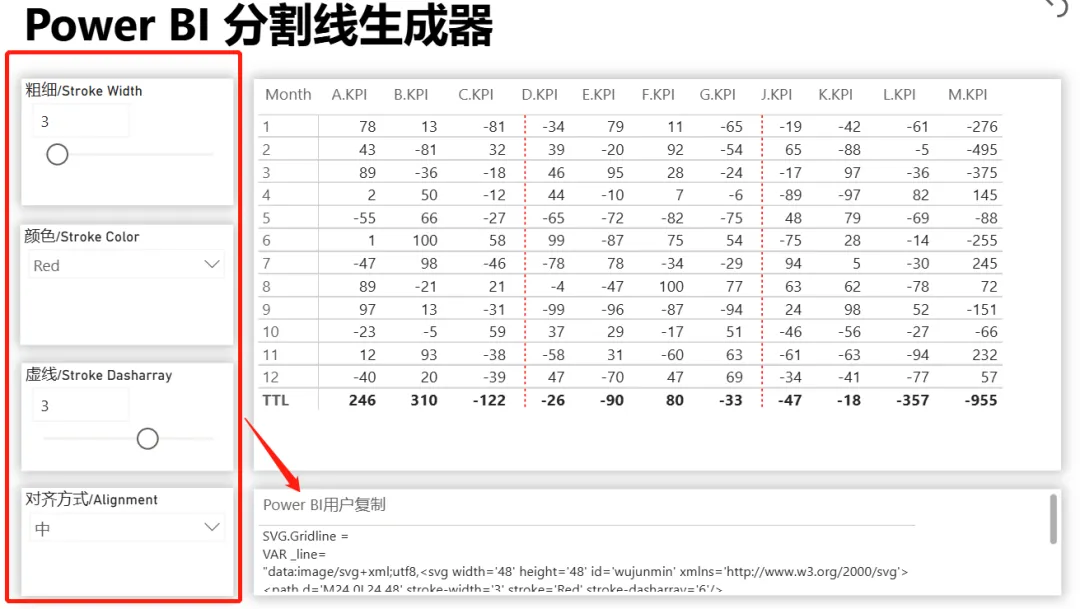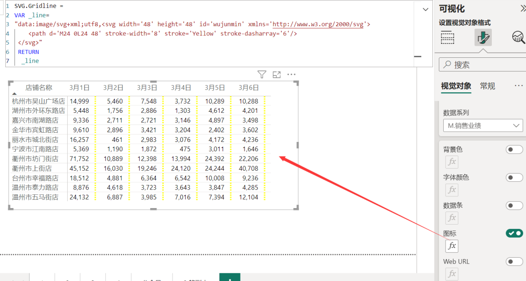 在线调整颜色、线条等样式后,复制右侧表格【Power BI用户复制】列的SVG代码。Power BI中新建度量值,如下构造: