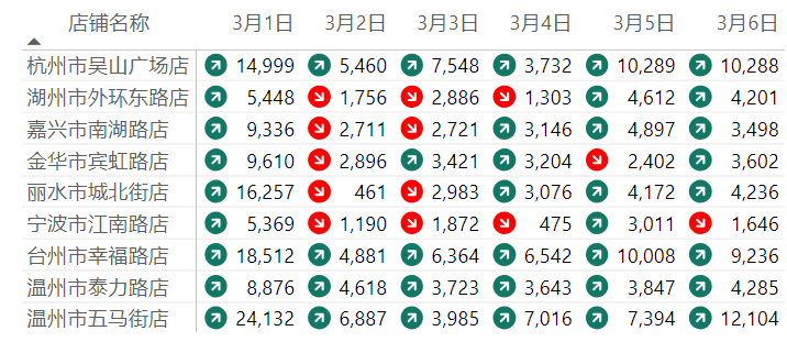 =IF([kpi]>0,绿色的向上箭头SVG代码,红色的向下箭头SVG代码)把度量值放到条件格式图标,得到: