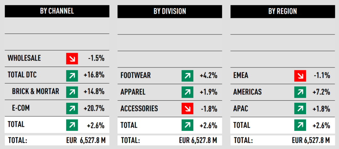 Puma的财报还有一个表格,每个值旁边有一个增长下降箭头,如下图所示: