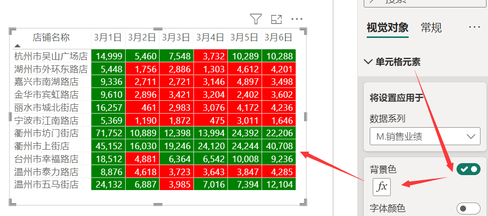 M.条件格式.背景色 = IF([M.销售业绩]>=5000,"green","red")矩阵单元格元素选择背景色,fx施加上方的度量值。