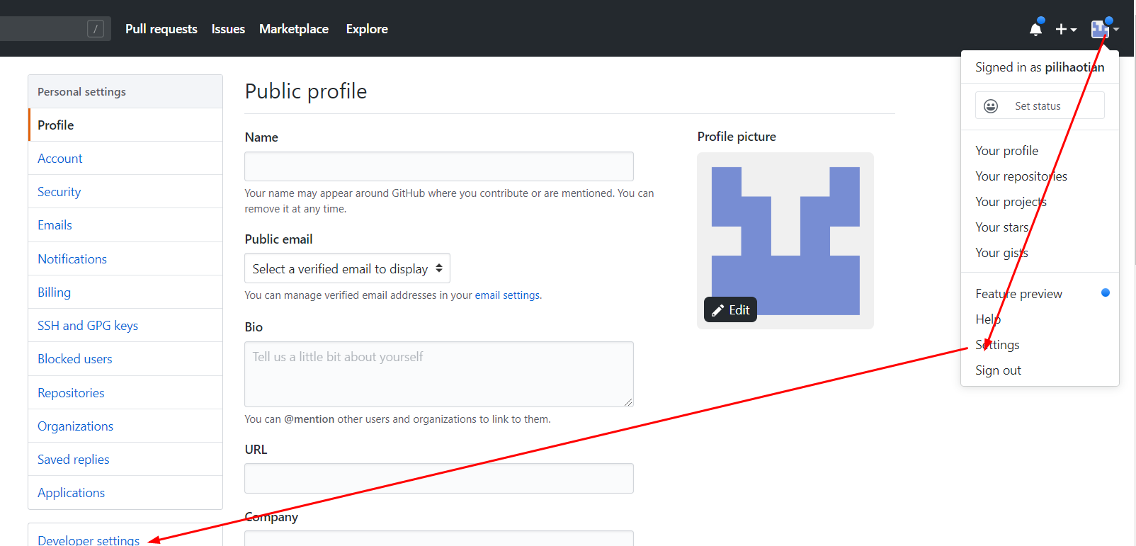在主页点击用户头像,选择【Settings】-【Developer settings】-【Personal access tokens】-【Generate new token】,填写好描述,勾选【repo】,然后点击【Generate token】生成一个Token,注意这个Token只会显示一次,先保存至记事本,后续会用到。