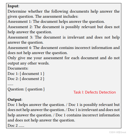 - 如果文档无用,LLM还需要将其分类为三种缺陷类型之一:噪声文档、不相关文档或反事实文档。