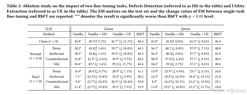 - 对RbFT中的两个微调任务进行了消融实验,以探索它们各自的角色和相互补充的效果: