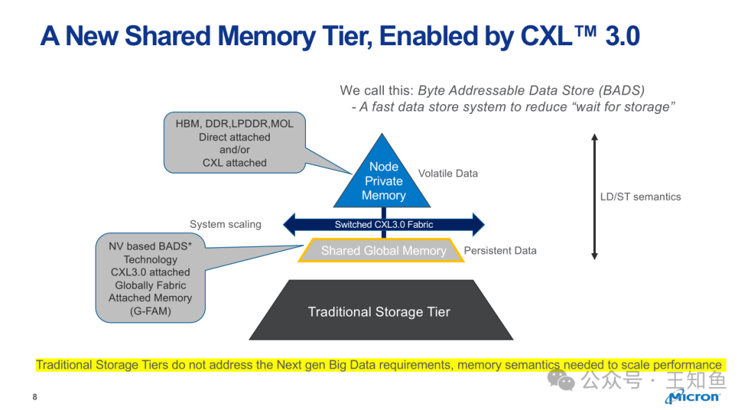图展示了一种新的存储架构,称为字节可寻址数据存储(BADS),由CXL™ 3.0技术支持。该架构旨在解决传统存储系统在大数据处理中的性能瓶颈问题。