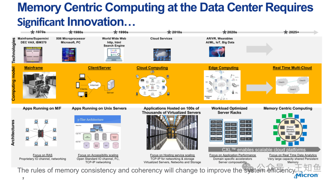 揭示计算系统向更大规模、更高效率发展的趋势,同时强调了内存中心计算在处理大规模数据和复杂应用中的重要性。它展示了如何通过不同的架构设计来优化系统性能,以满足从传统数据库到现代机器学习等各种应用场景的需求。