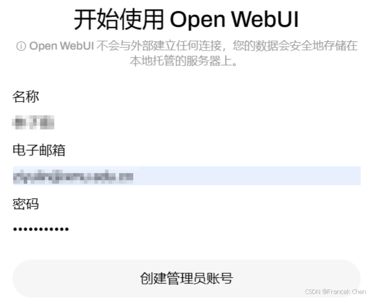 Open WebUI支持中文界面,可以在设置中调整语言,默认是你的Windows系统当前正在使用的语言。首先,需要注册一个管理员账号(如图14所示),然后,就可以开始使用了。