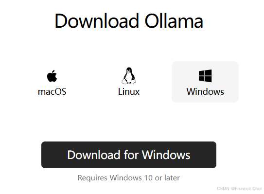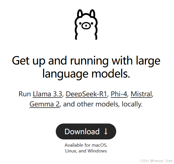 访问Ollama官网(https://ollama.com/), 点击“Download”(如图2所示),根据操作系统(Windows、macOS或Linux)下载自己操作系统对应的安装包(如图3所示),比如,Windows用户可以点击“Windows”图标,然后,点击“Download for Windows”下载安装包。需要注意的是,对于Windows系统,这里仅支持Windows10及其以上版本。